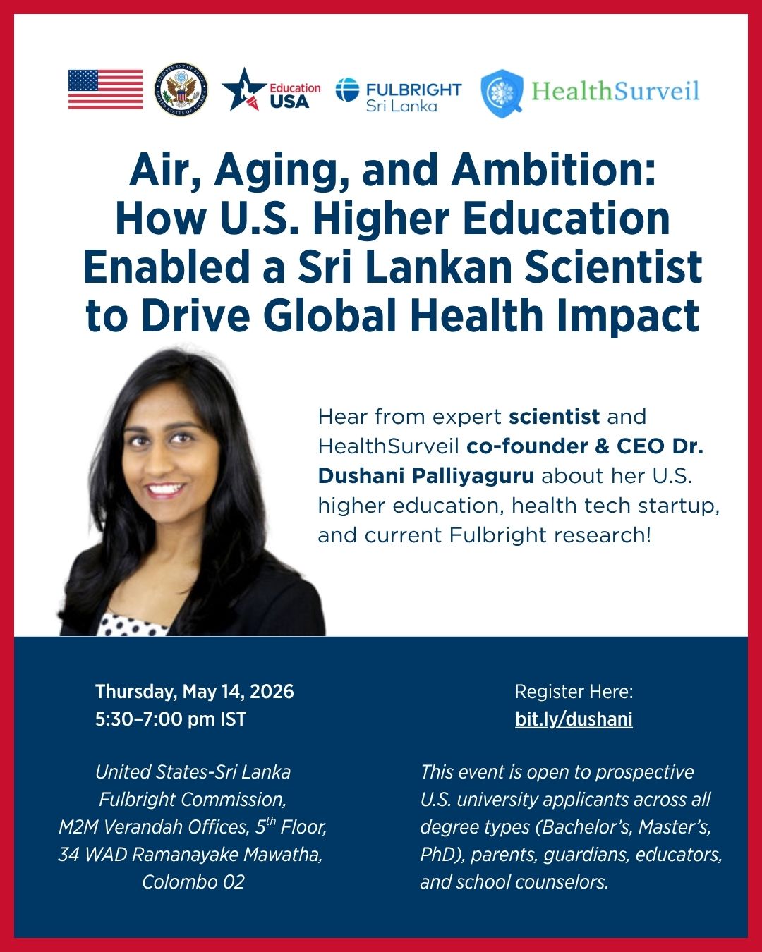 In this interactive session with EducationUSA Sri Lanka and Fulbright Sri Lanka, Dr. Palliyaguru will share her journey as a school student in Sri Lanka who pursued higher education from her Bachelor’s degree to PhD in the United States. She will discuss her career path to becoming a startup founder and CEO plus her Fulbright research with ample time for dialogue and networking.