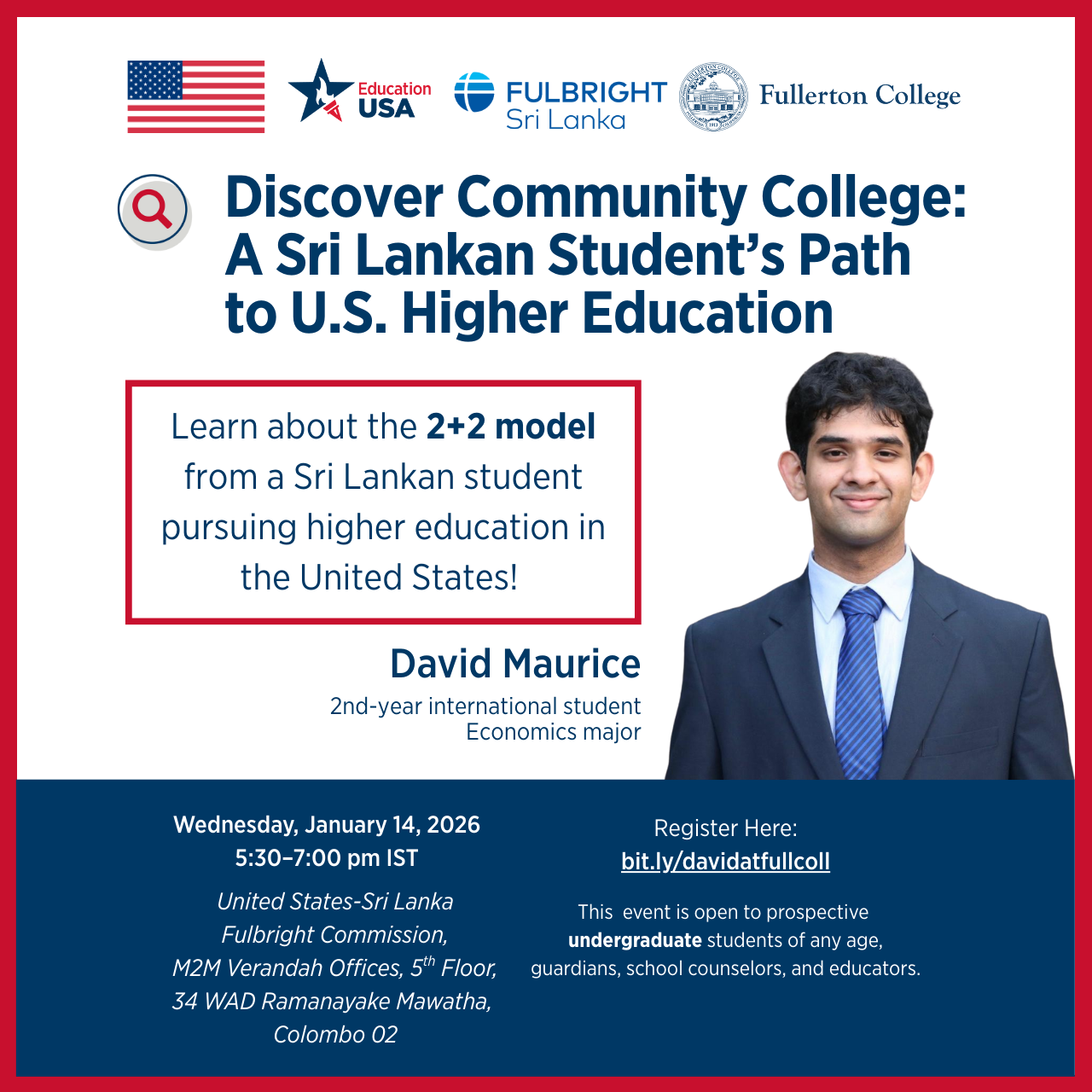 Join EducationUSA Sri Lanka at US-SLFC and Fullerton College for an authentic insight into community college from the perspective of a current Sri Lankan student!