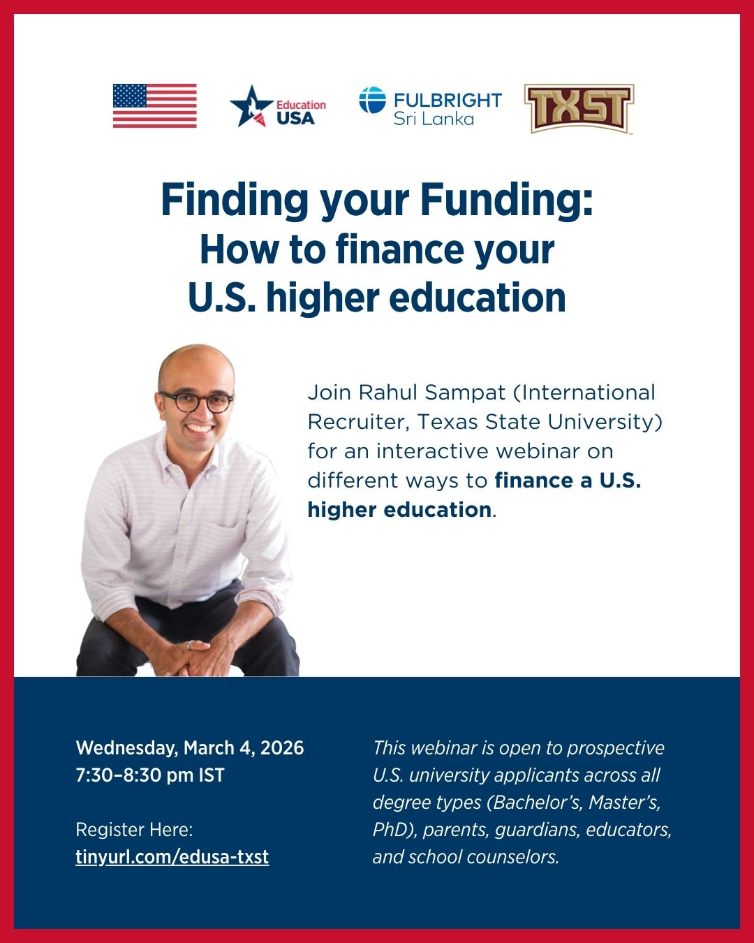 Join Rahul Sampat (International Recruiter, Texas State University) for an interactive webinar on different ways to finance a U.S. higher education and learn about opportunities for international students in Texas. This session will include a brief presentation and Q&A.